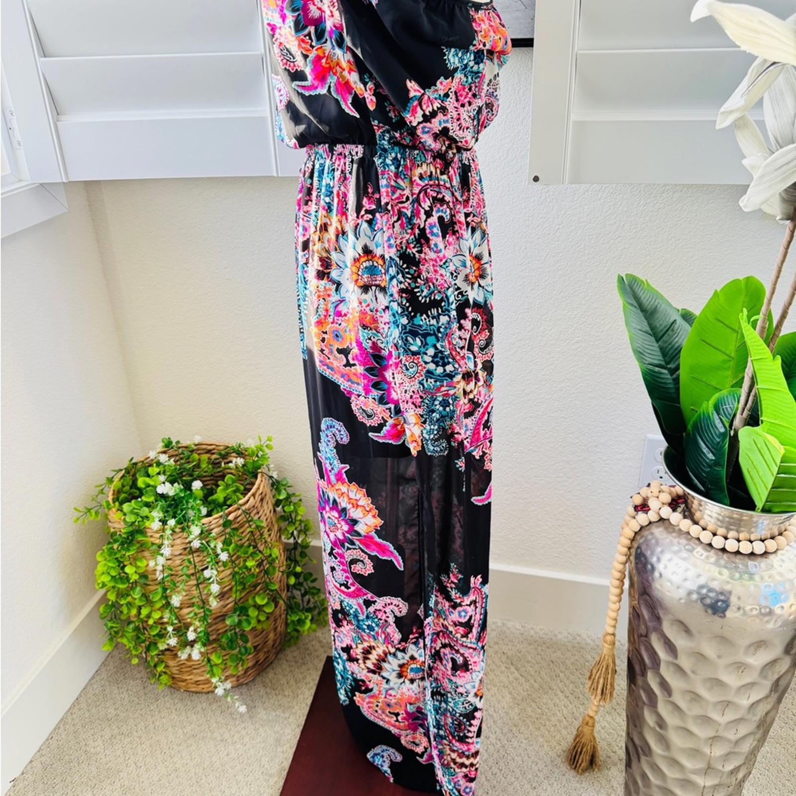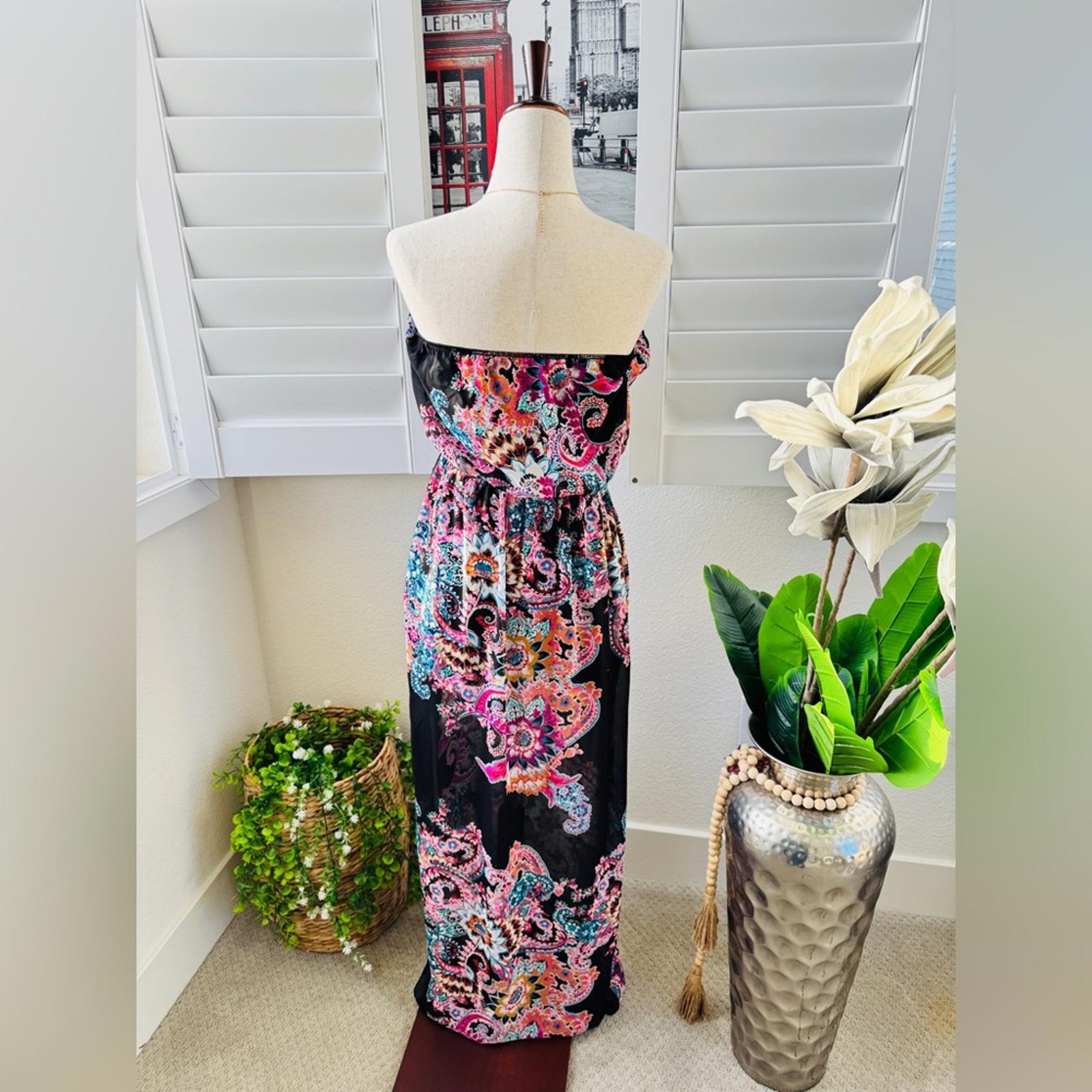 Strapless maxi dress by Express. Black base with pink and teal paisley print. Elasticized waist for a feminine silhouette. Lightweight and flowy fabric. Great for day or evening wear.