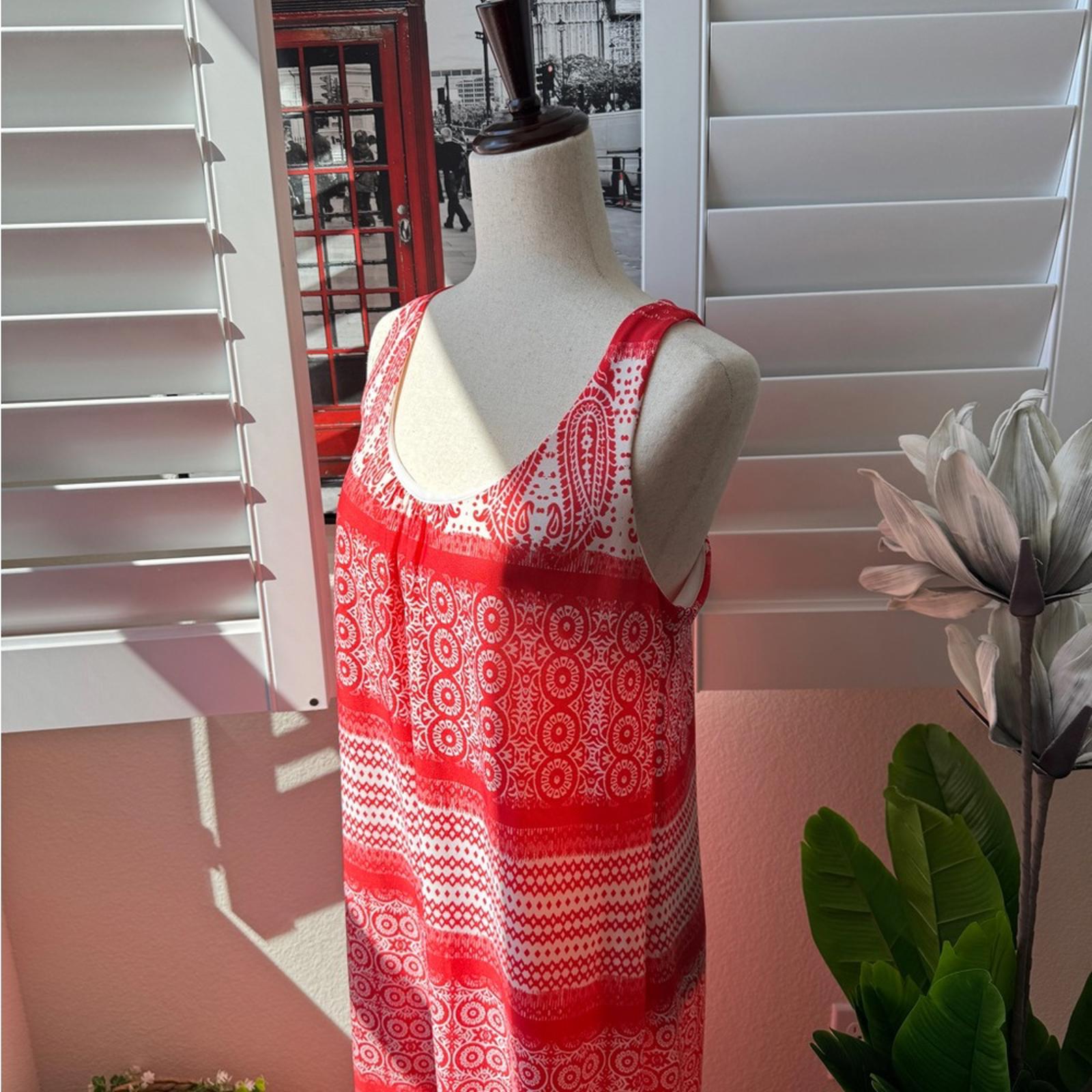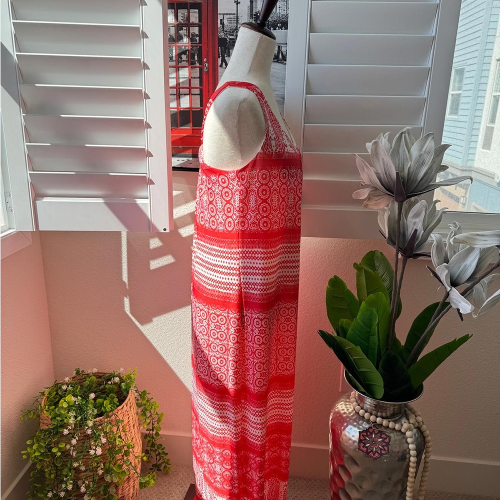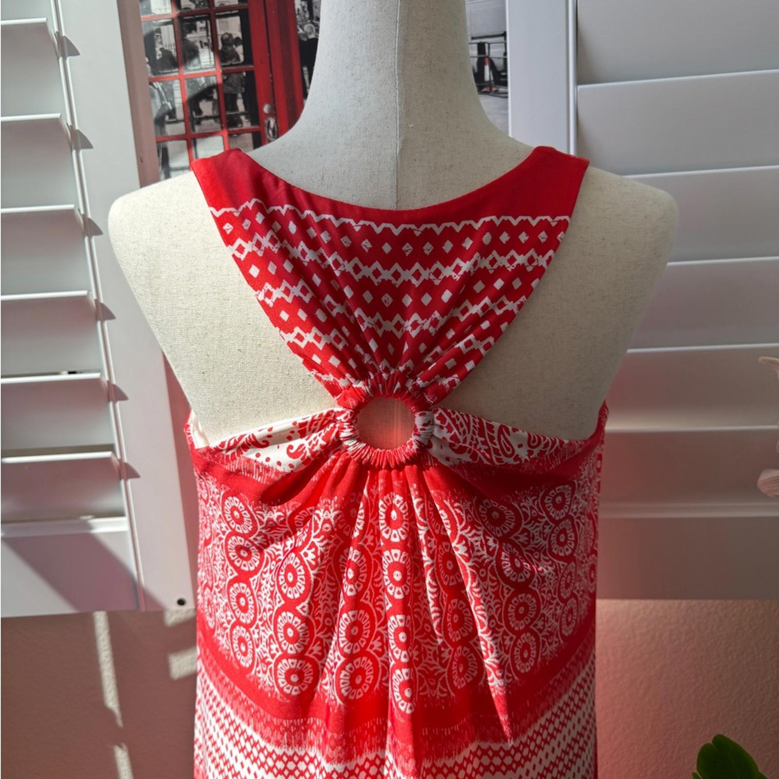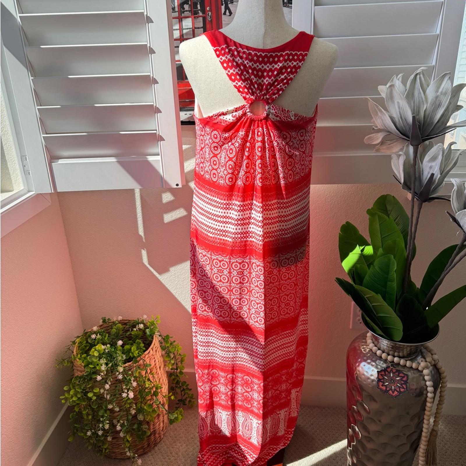 This is a stunning, high-contrast boho maxi dress from GNW. Featuring a bold red and white paisley medallion print, this piece is designed for effortless summer style with a touch of Mediterranean flair.
