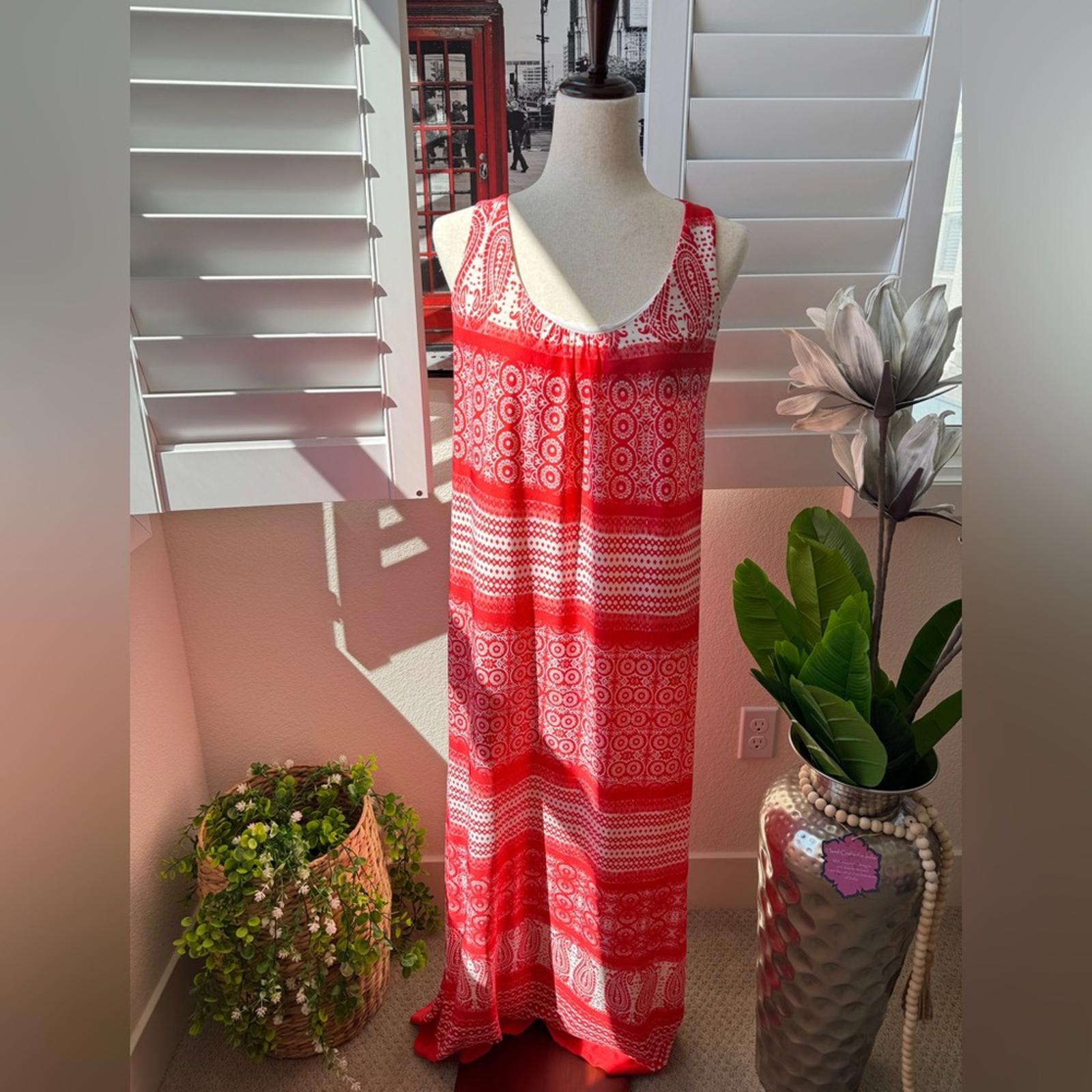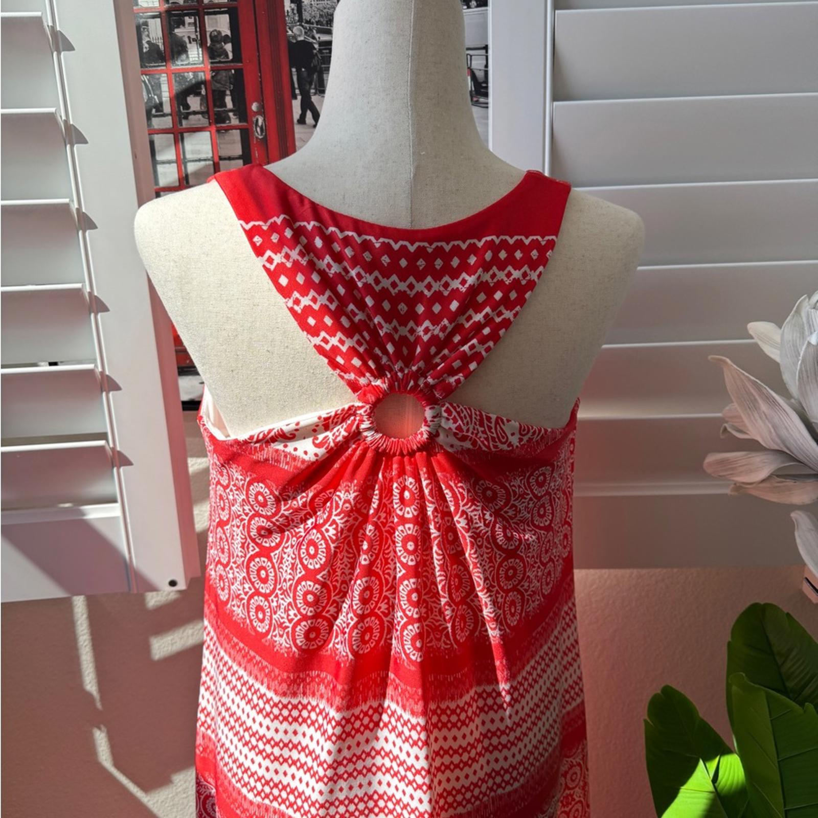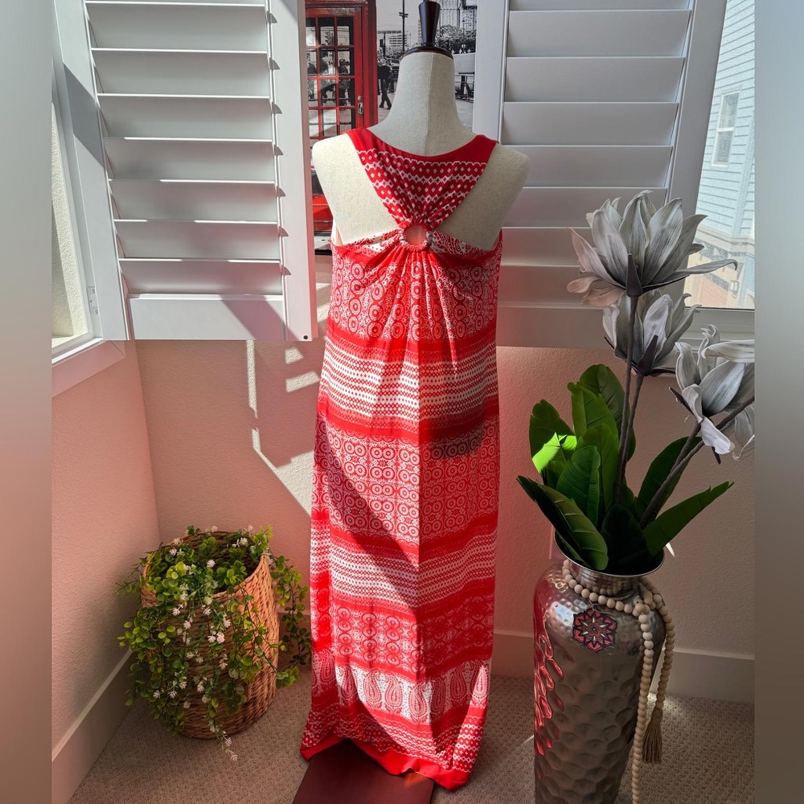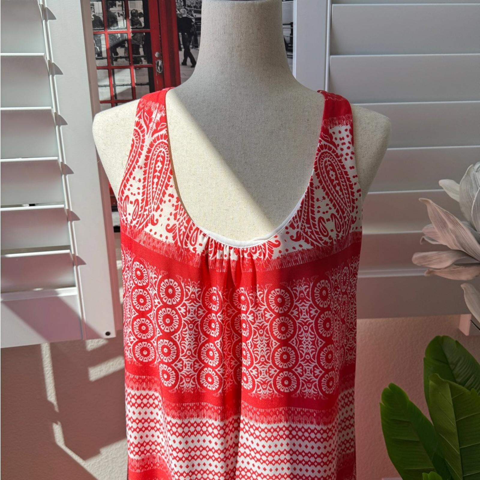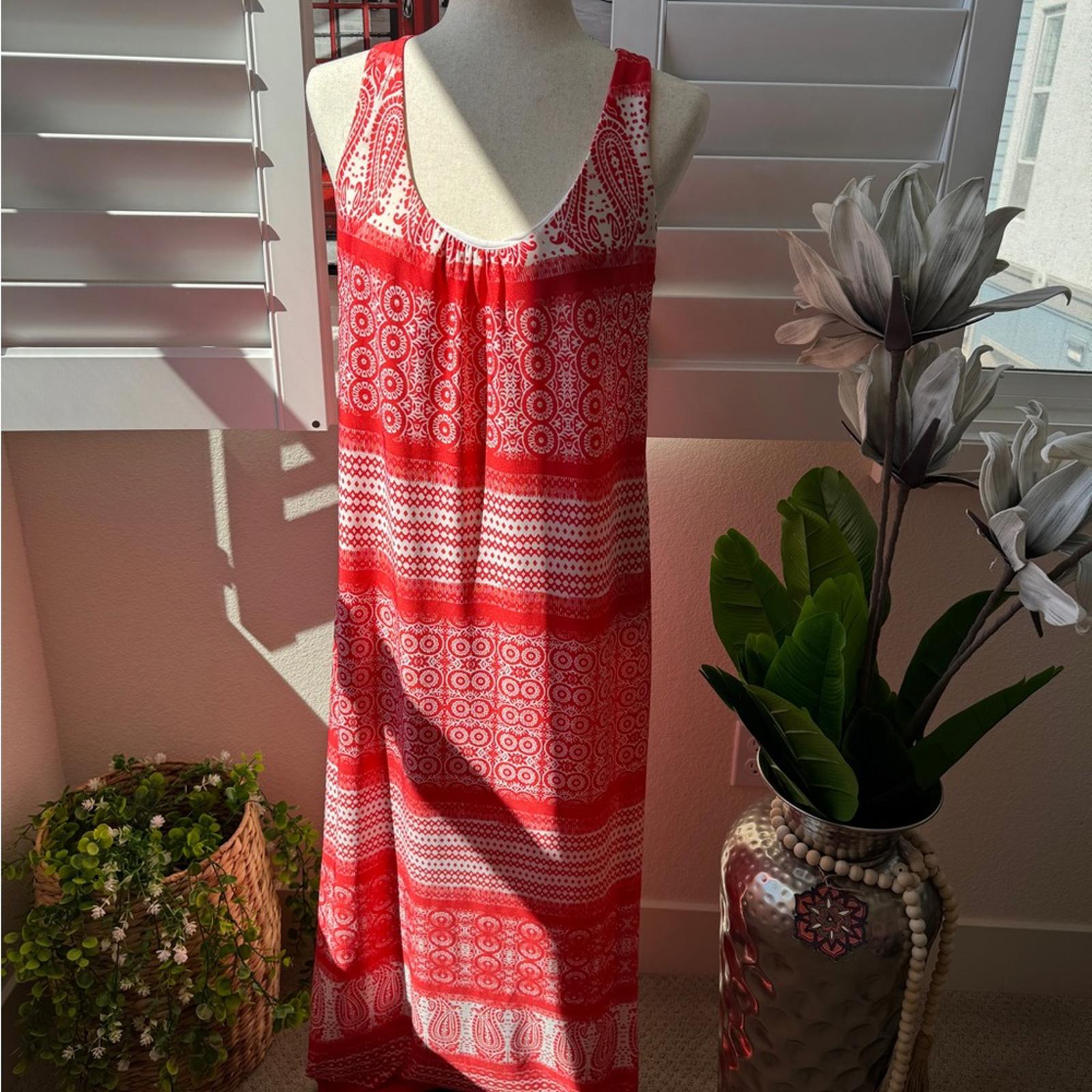 This is a stunning, high-contrast boho maxi dress from GNW. Featuring a bold red and white paisley medallion print, this piece is designed for effortless summer style with a touch of Mediterranean flair.